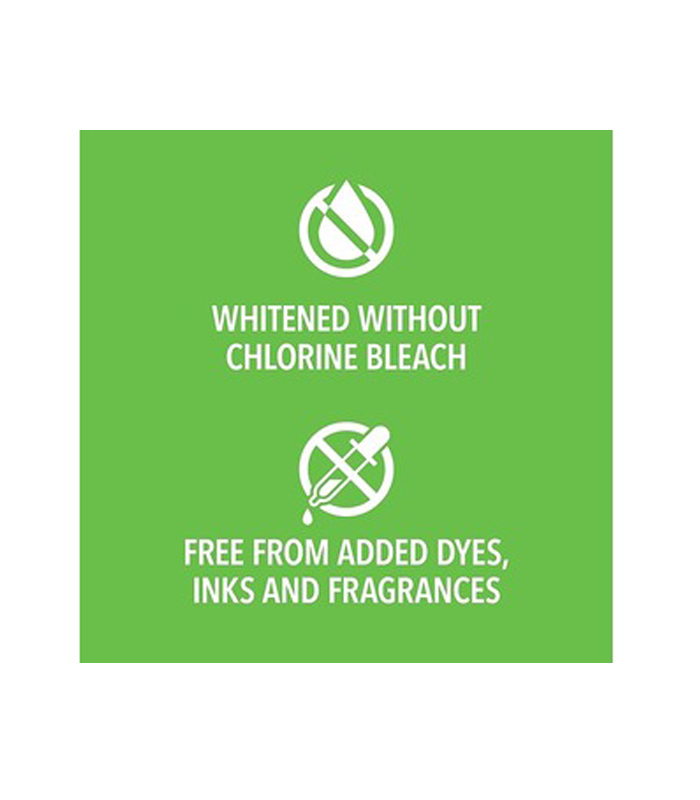 • 24 paper towel rolls, produced from 100% recycled paper, whitened without chlorine bleaching, and free of any dyes, inks or fragrances