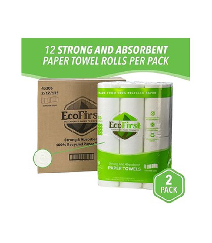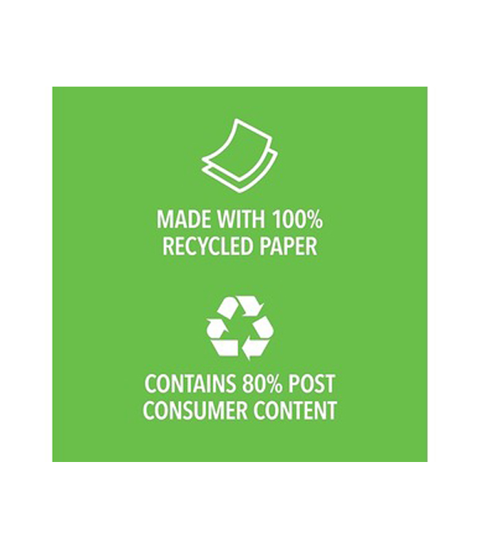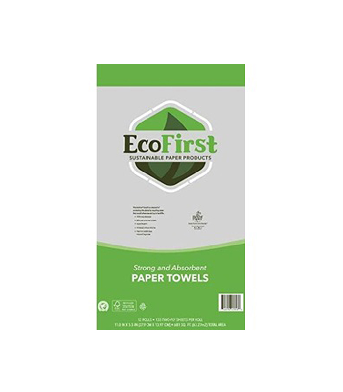 EcoFirst recycled paper towels are made with 100% Grade A recycled paper, which provides the perfect balance of strength and absorbency. Contains 80% post-consumer content, including discarded office papers and files that would otherwise end up in landfills. With the combination of exceptional performance and commitment to environmental protection, you can feel good about using these eco paper towels. This product is free of any added dyes, inks or fragrances, and whitened without chlorine.