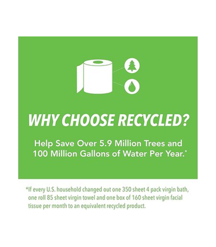 The EcoFirst brand believes in environmental stewardship and protecting the planet by recycling paper. If every US household replaced one 4-pack, 350 sheet virgin bath tissue, one 85-sheet virgin paper towel roll and one 160-sheet virgin facial tissue box every month with an equivalent recycled product, we could help save 5.9 million trees and 100 million gallons of water. EcoFirst toilet tissue, facial tissue and paper napkins are also available! Try them all and help protect our planet!