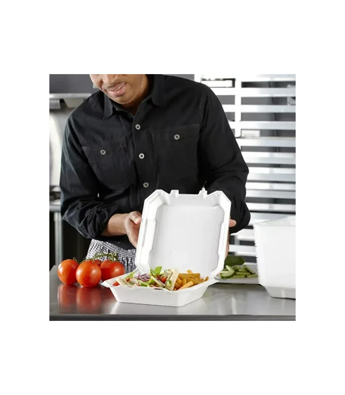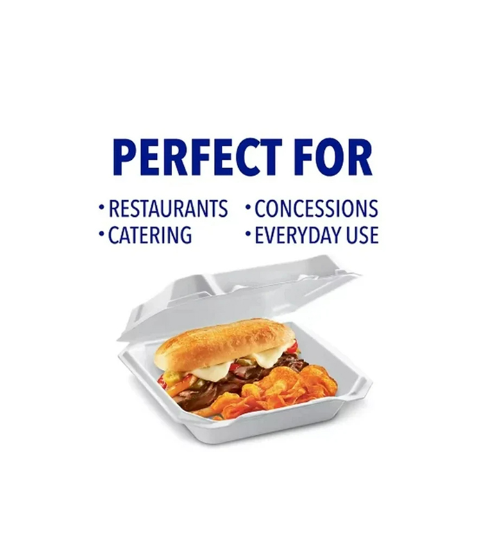 These foam containers with hinged lids are perfect for use in the food industry, in both restaurants and for catering companies. The containers are strong and sturdy, capable of holding a variety of entrees, like barbecued meats, spaghetti and meatballs, hot dogs and burgers, as well as tasty side dishes, like antipasto salads, baked potatoes, corn cobs and nachos or even desserts, like gooey pies, frosted cakes and more. Diners can bring home leftovers from restaurants, cafes, catered weddings, corporate events and more with ease and not have to worry about dips, slips, seeps or dents. The containers are also sturdy enough to eat out of and can easily be stacked in the fridge.