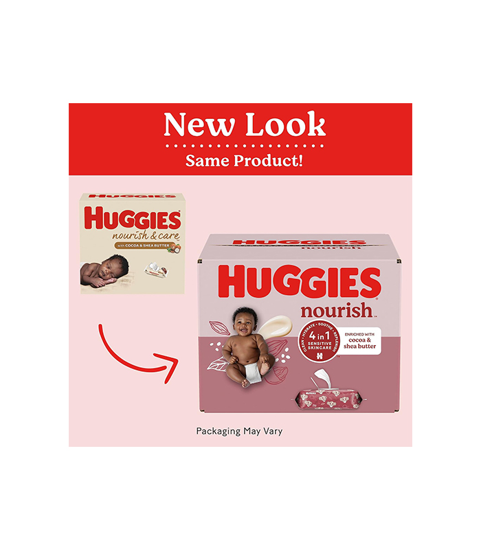 Huggies Nourish & Care Baby Wipes. 8 push button packs of 56 scented baby wipes (448 wipes total). Cocoa and shea butter scented.