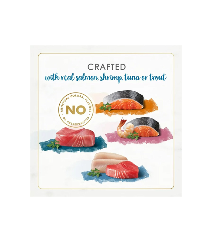 Purina Fancy Feast Gourmet Naturals Wet Cat Food Variety Pack, Serve your cat a gourmet seafood meal worthy of her discriminating palate with a selection from this Purina Fancy Feast Gourmet Naturals Seafood Recipe adult wet cat food variety pack. Containing 30 cans and four tantalizing seafood recipes, this assortment includes Alaskan salmon, shrimp, trout and tuna to tempt the taste buds of the pickiest of felines. Every delectable wet food recipe provides natural ingredients with added vitamins, minerals and nutrients to deliver 100 percent complete and balanced nutrition for adult cats.